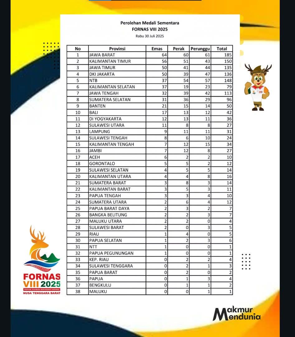 Mataram- Hingga hari keenam, Rabu (30/7) penyelenggaraan Festival Olahraga Masyarakat Nasional (Fornas) VIII di NTB 2025, tuan rumah Nusa Tenggara Barat (NTB) naik ke posisi 5 peraihan mendali, yang dimana sehari sebelumnya hanya menduduki peringkat ke 9.NTB naik ke 5 di FORNAS VIII NTB 2025 setelah hari ini Rabu (30/7) menambah perolehan 23 medali emas lagi dari beberapa Inorga.